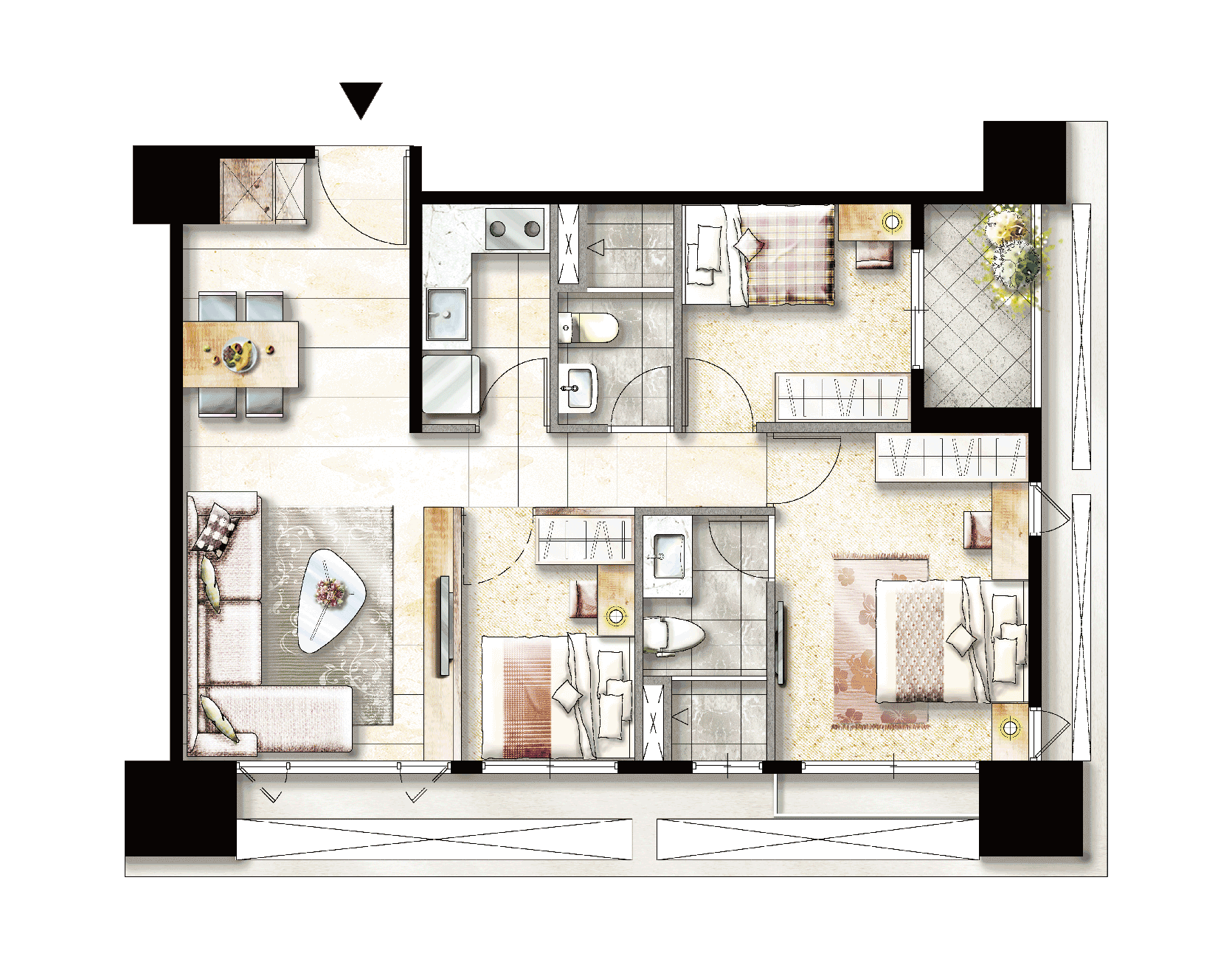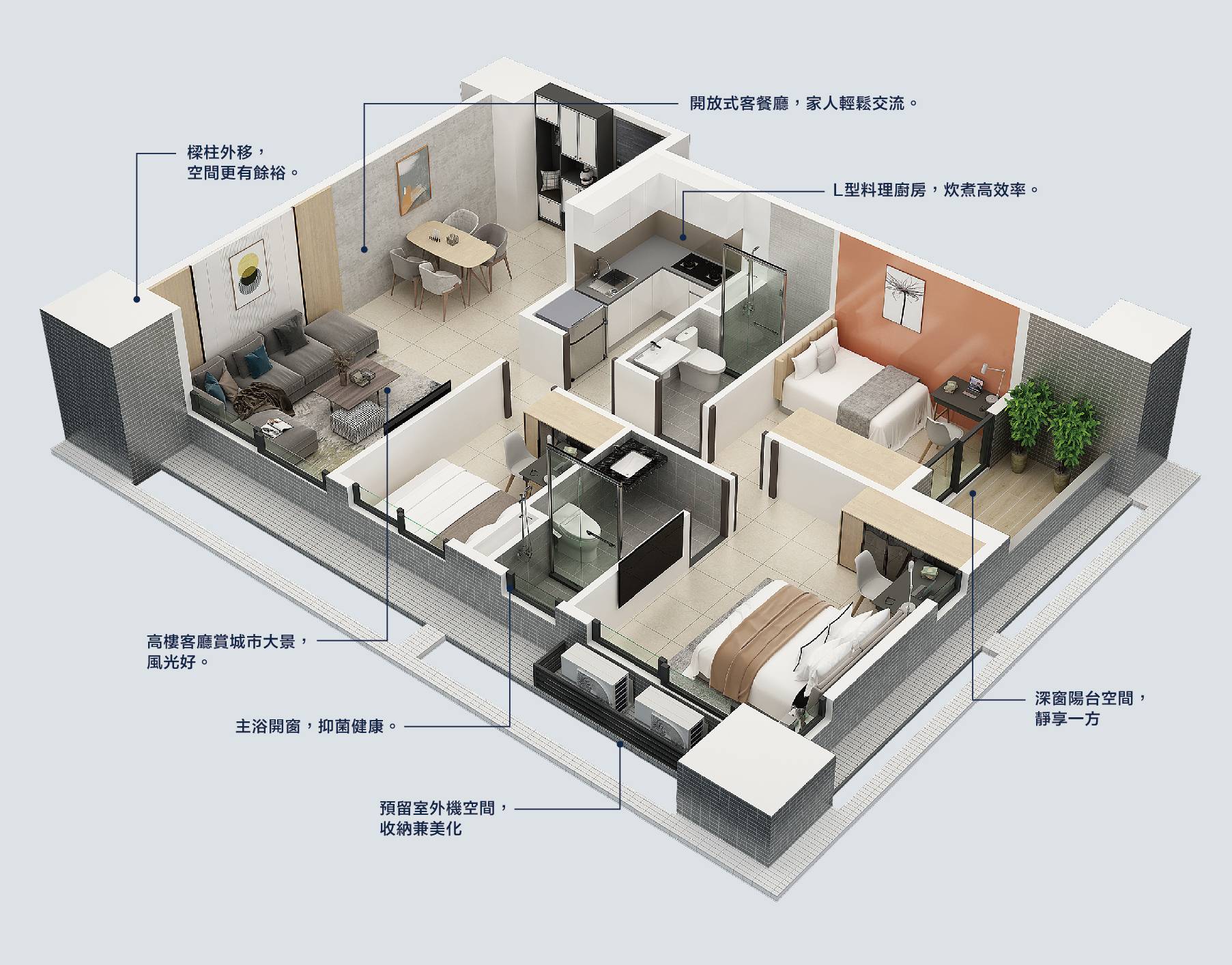 2D、3D傢俱配置參考圖上各項裝潢、傢俱、裝飾、植栽造景、室內器具…等,均非本買賣契約之標的,僅供擺設參考。各樓層外觀造型,依現況為準,實際空間、格局、門窗開向及尺寸樣式、建材規格及樣式(含色系),依各該房屋完工成屋現況為準。