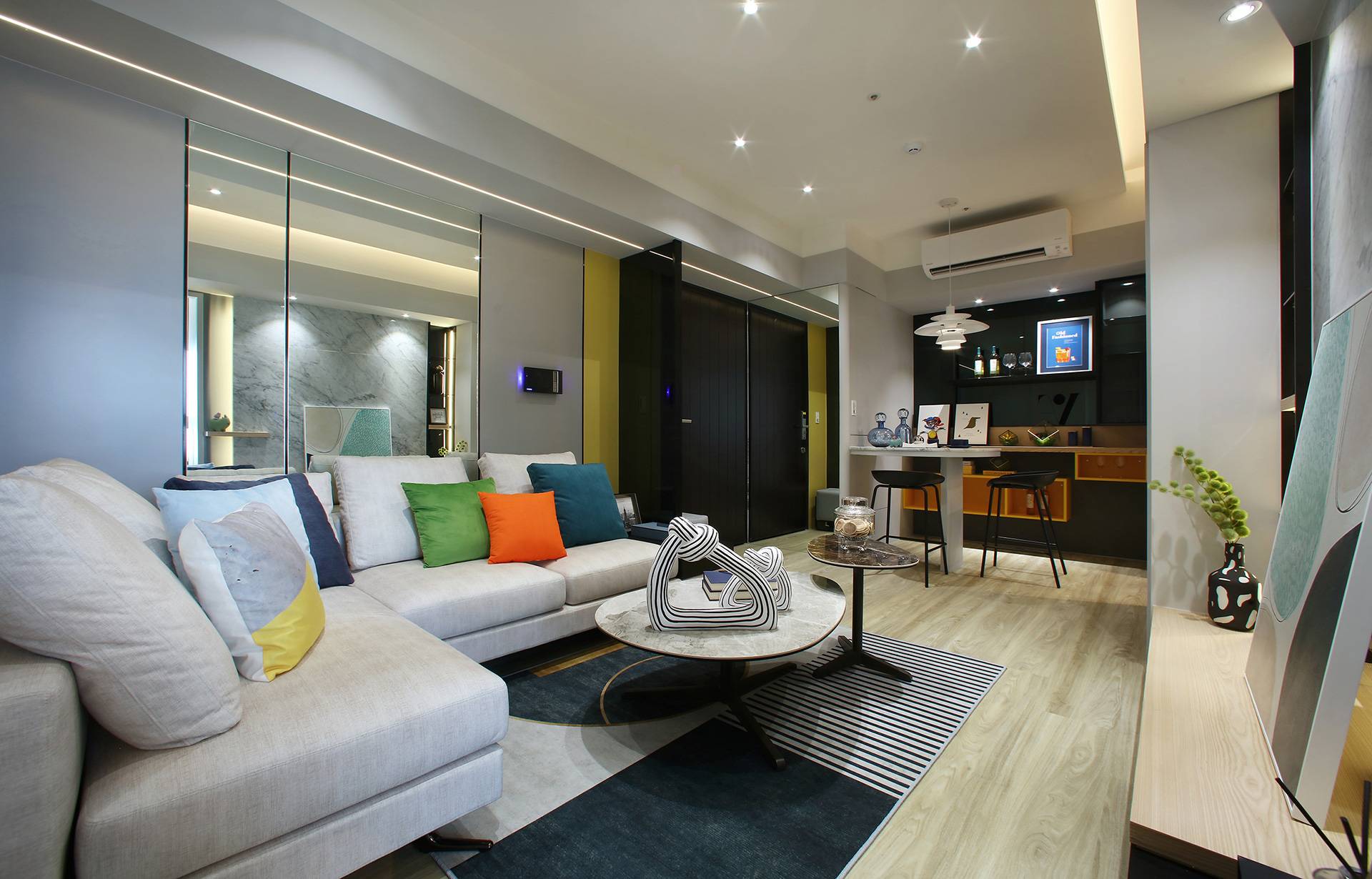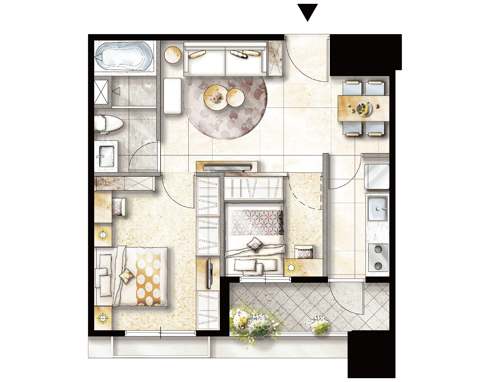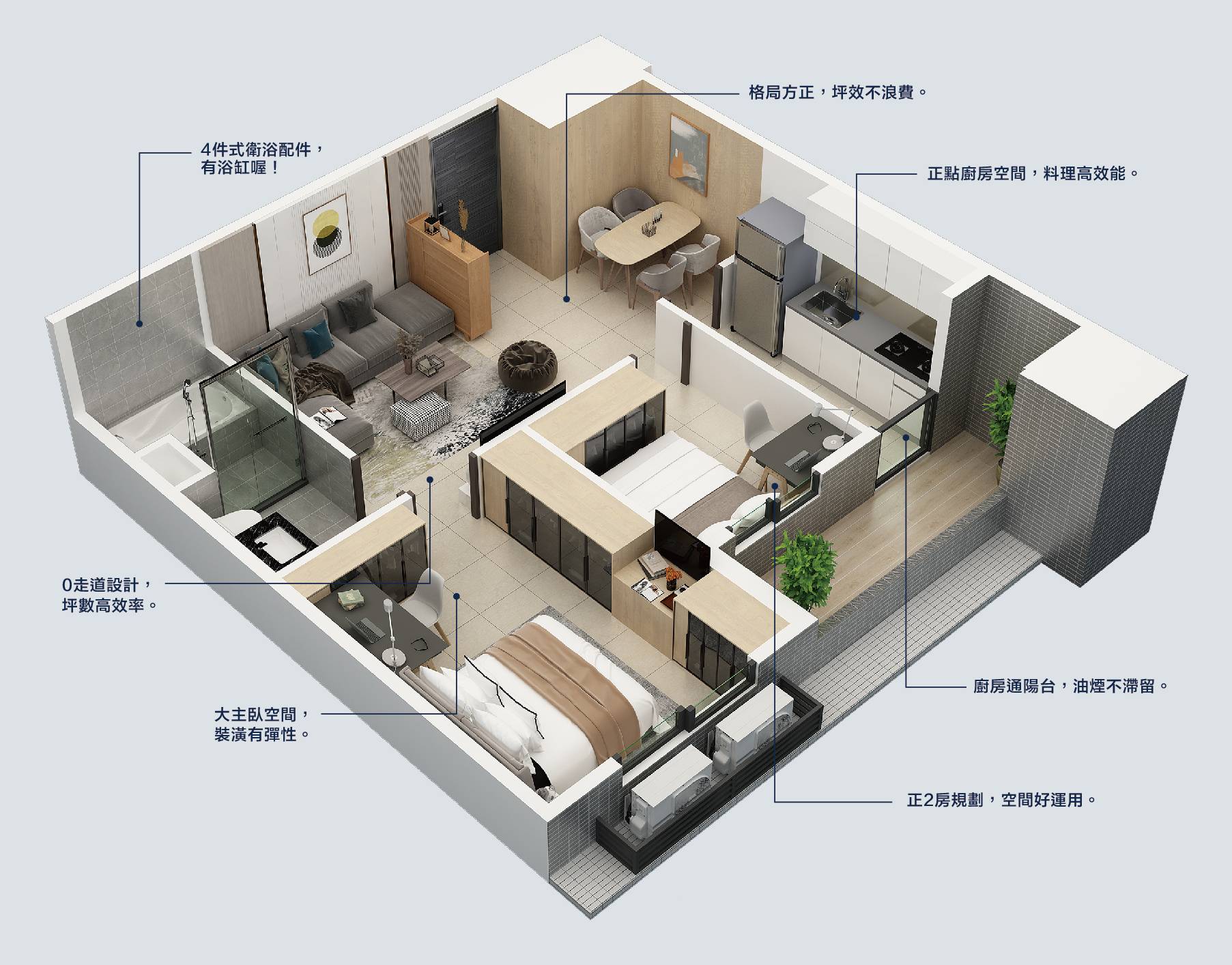 2D、3D傢俱配置參考圖上各項裝潢、傢俱、裝飾、植栽造景、室內器具…等,均非本買賣契約之標的,僅供擺設參考。各樓層外觀造型,依現況為準,實際空間、格局、門窗開向及尺寸樣式、建材規格及樣式(含色系),依各該房屋完工成屋現況為準。