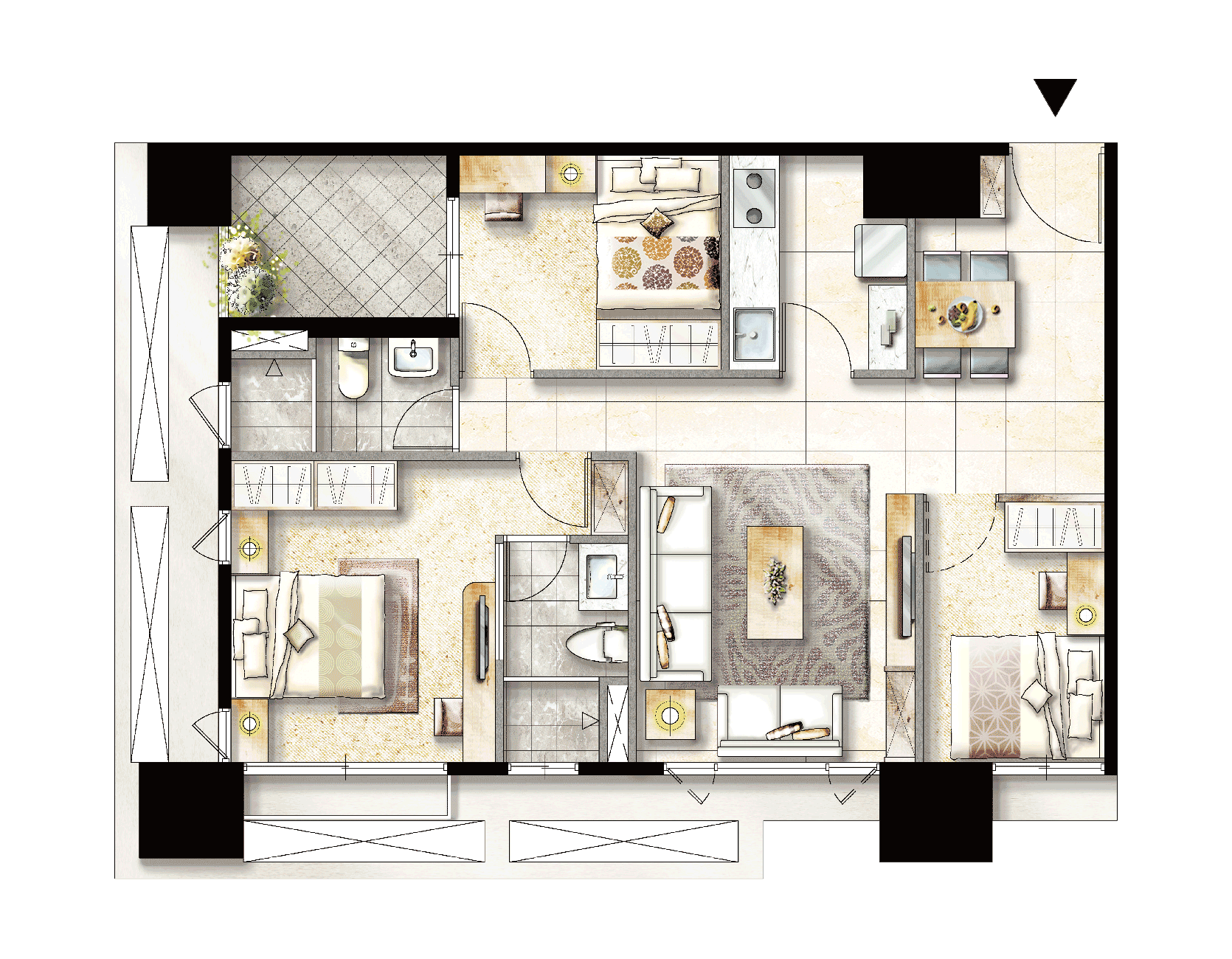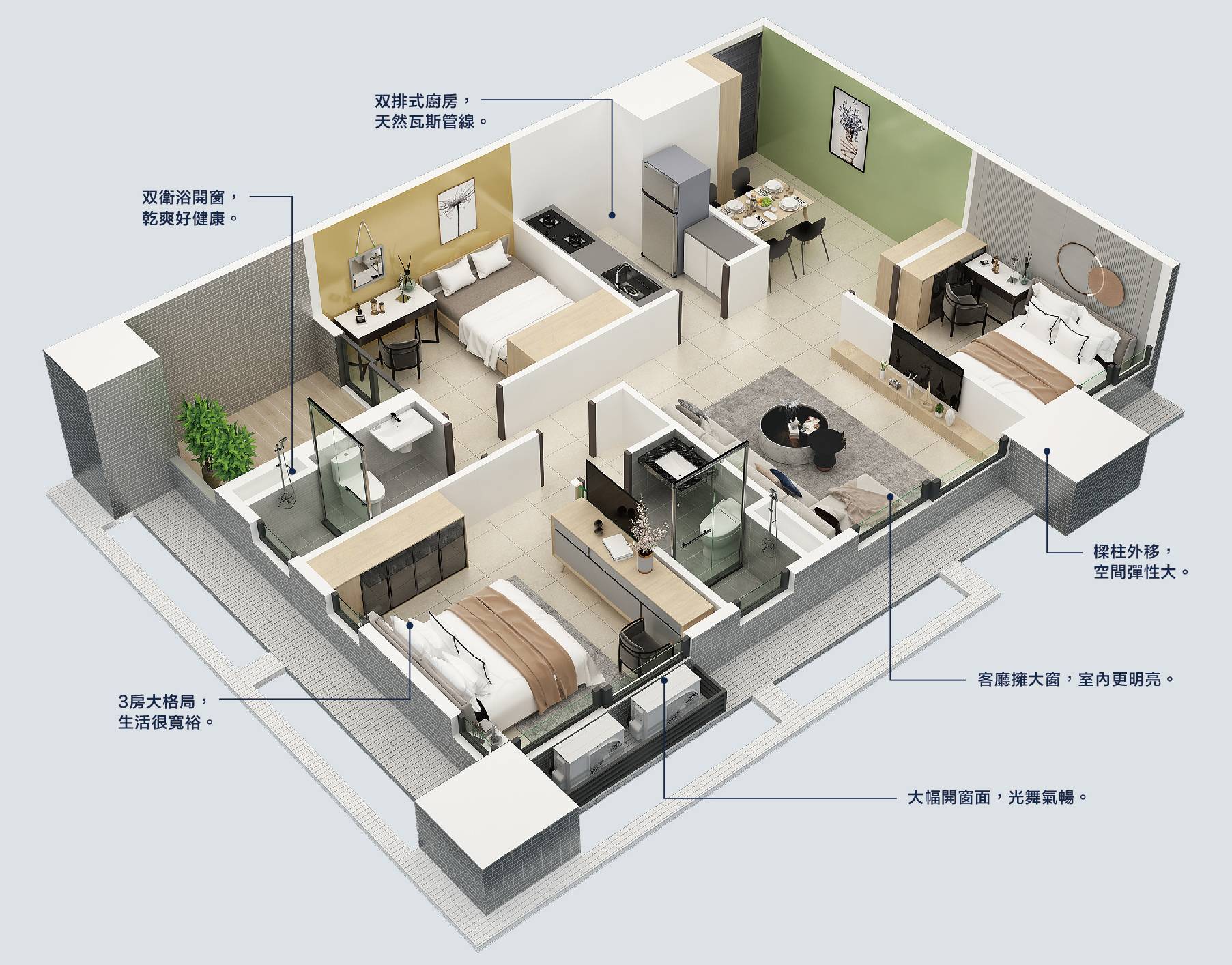 2D、3D傢俱配置參考圖上各項裝潢、傢俱、裝飾、植栽造景、室內器具…等,均非本買賣契約之標的,僅供擺設參考。各樓層外觀造型,依現況為準,實際空間、格局、門窗開向及尺寸樣式、建材規格及樣式(含色系),依各該房屋完工成屋現況為準。