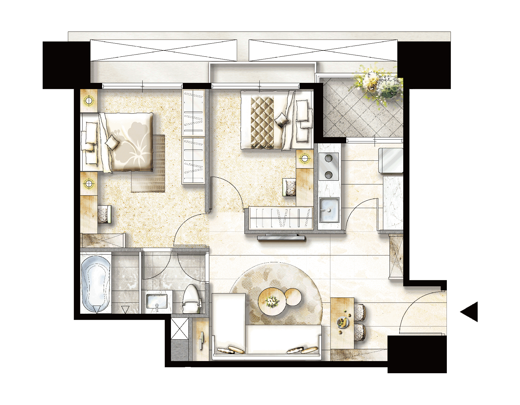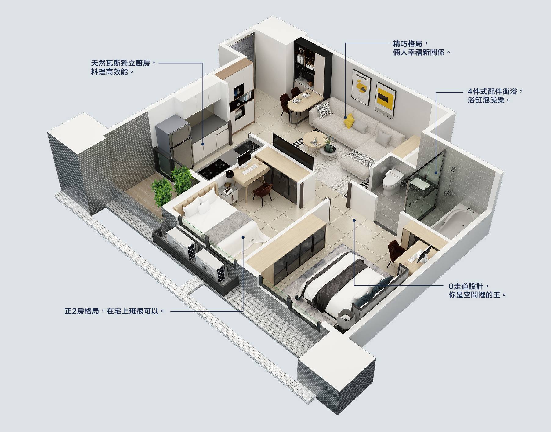 2D、3D傢俱配置參考圖上各項裝潢、傢俱、裝飾、植栽造景、室內器具…等,均非本買賣契約之標的,僅供擺設參考。各樓層外觀造型,依現況為準,實際空間、格局、門窗開向及尺寸樣式、建材規格及樣式(含色系),依各該房屋完工成屋現況為準。